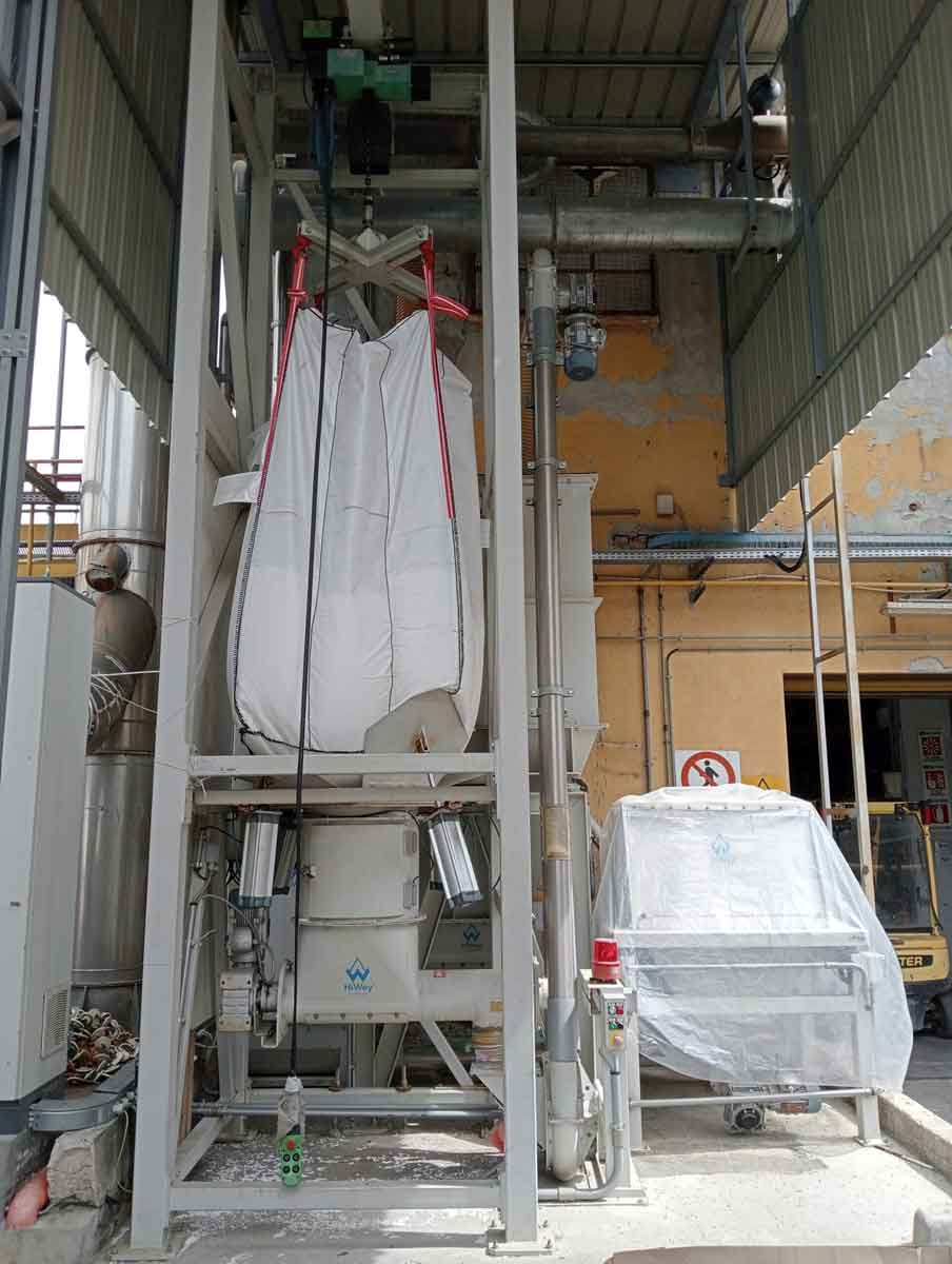 Possibilità di carico dei big-bag nella struttura sia per mezzo muletto che per mezzo paranco. Una volta in posizione, in tutta sicurezza, viene avviato un taglio automatico circolare che permette lo scarico del materiale. Infine, un rompigrumi agevola l’accesso nella linea.