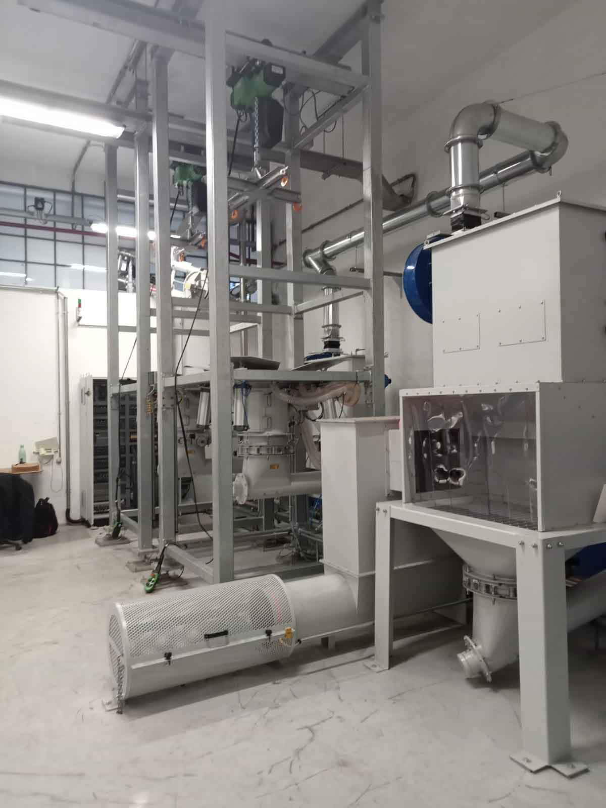 Stazione che presenta sia l’aspirazione sia una coclea sottostante per immettere il materiale nella linea. La sua particolarità è uno sportello automatico per la chiusura della bocca dove viene immesso il sacco con il materiale.